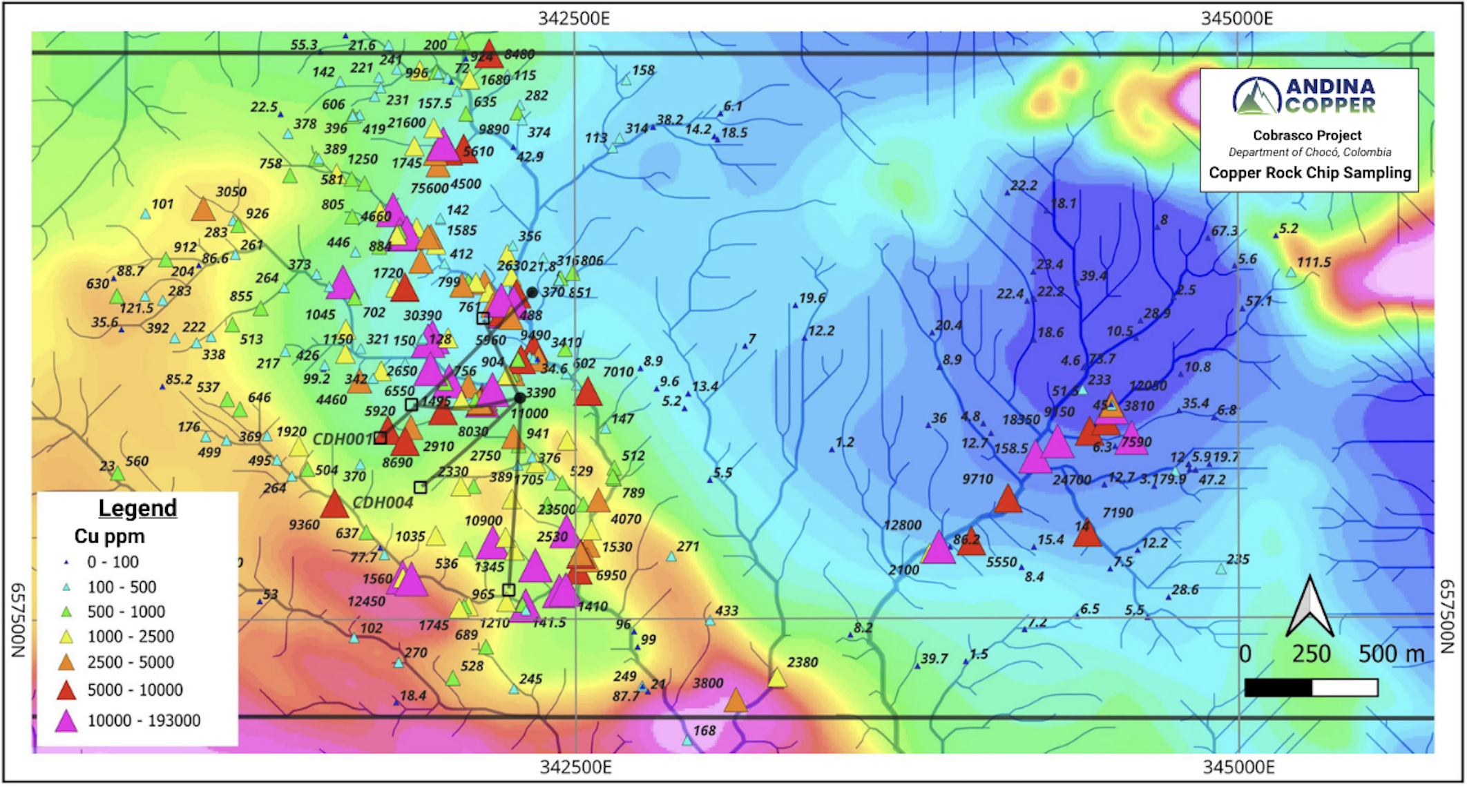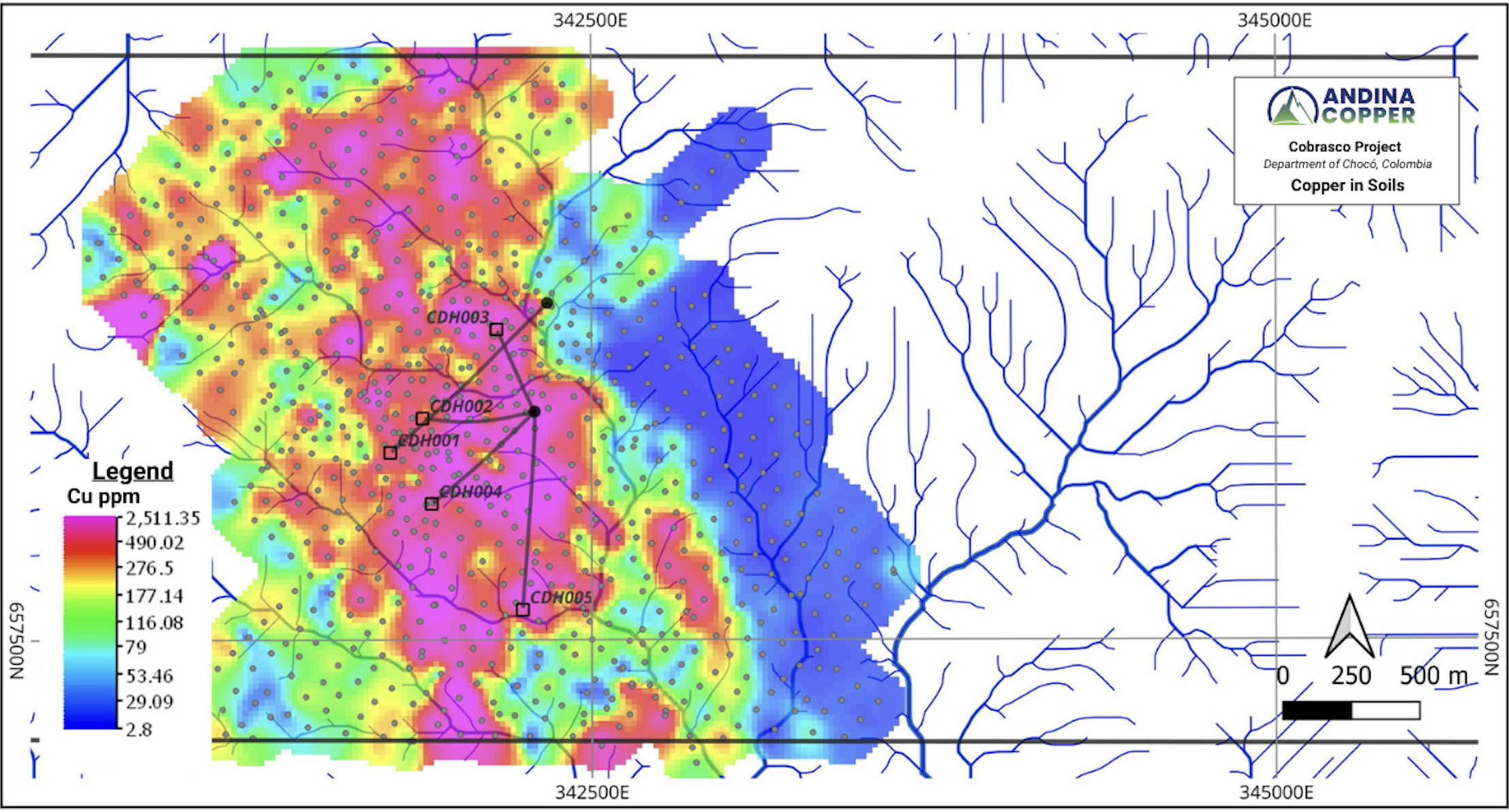 Figures 1, 2 and 3 show the results of recent stream sediment sampling, rock chip geochemical sampling and grid-based soil (auger) geochemistry completed over the northern Cobrasco block.