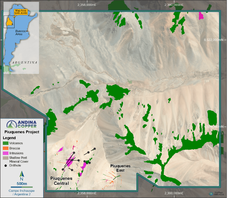 7.1 km of diamond drilling has been completed across 8 holes (PIU-01 to PIU-08) at Piuquenes Central and Piuquenes East, confirming a gold-rich porphyry Cu system at Central and a second porphyry system at East.