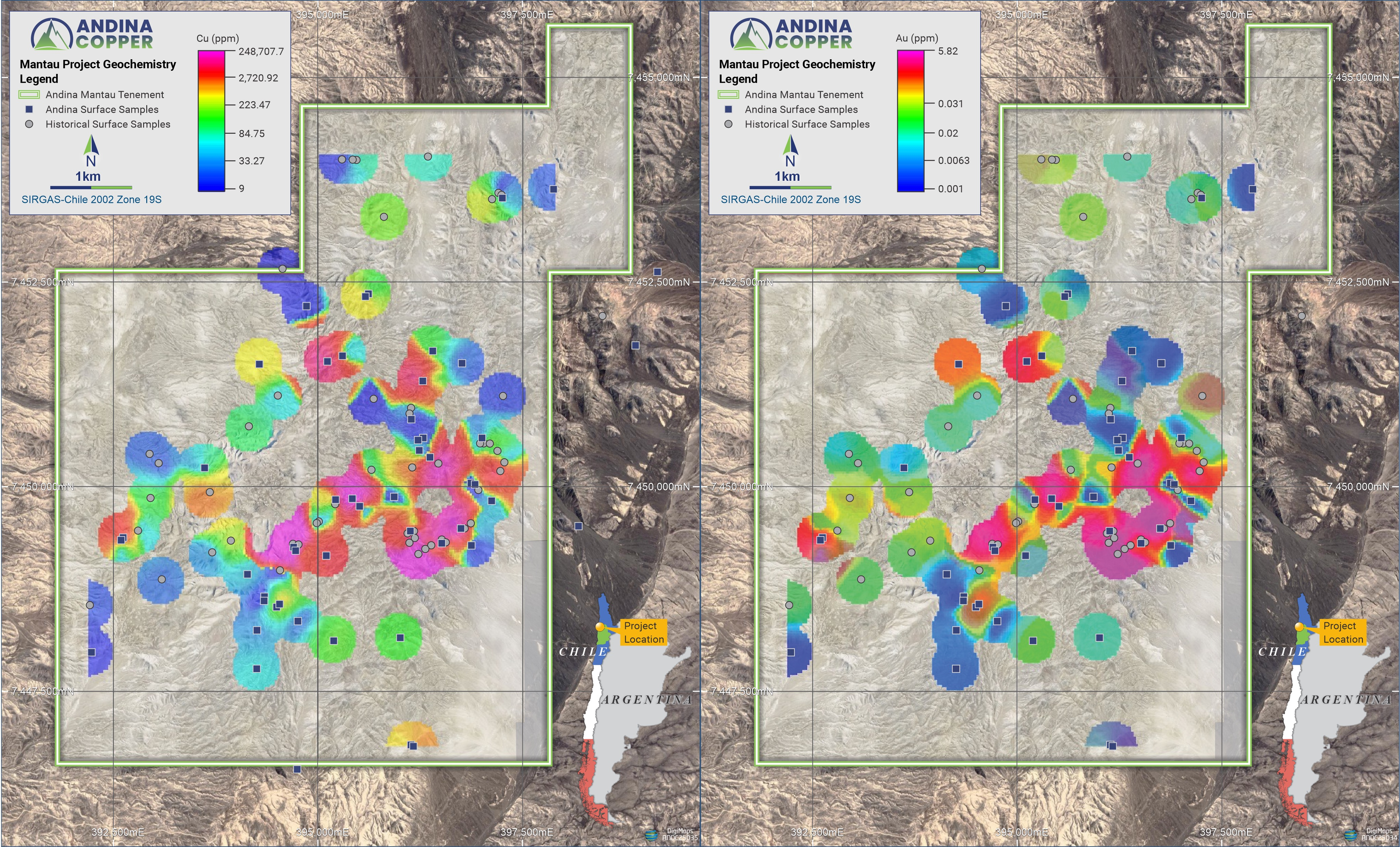 Figure 3: Gridded copper (LHS) and gold (RHS) geochemistry from historical and Andina Copper surface samples.