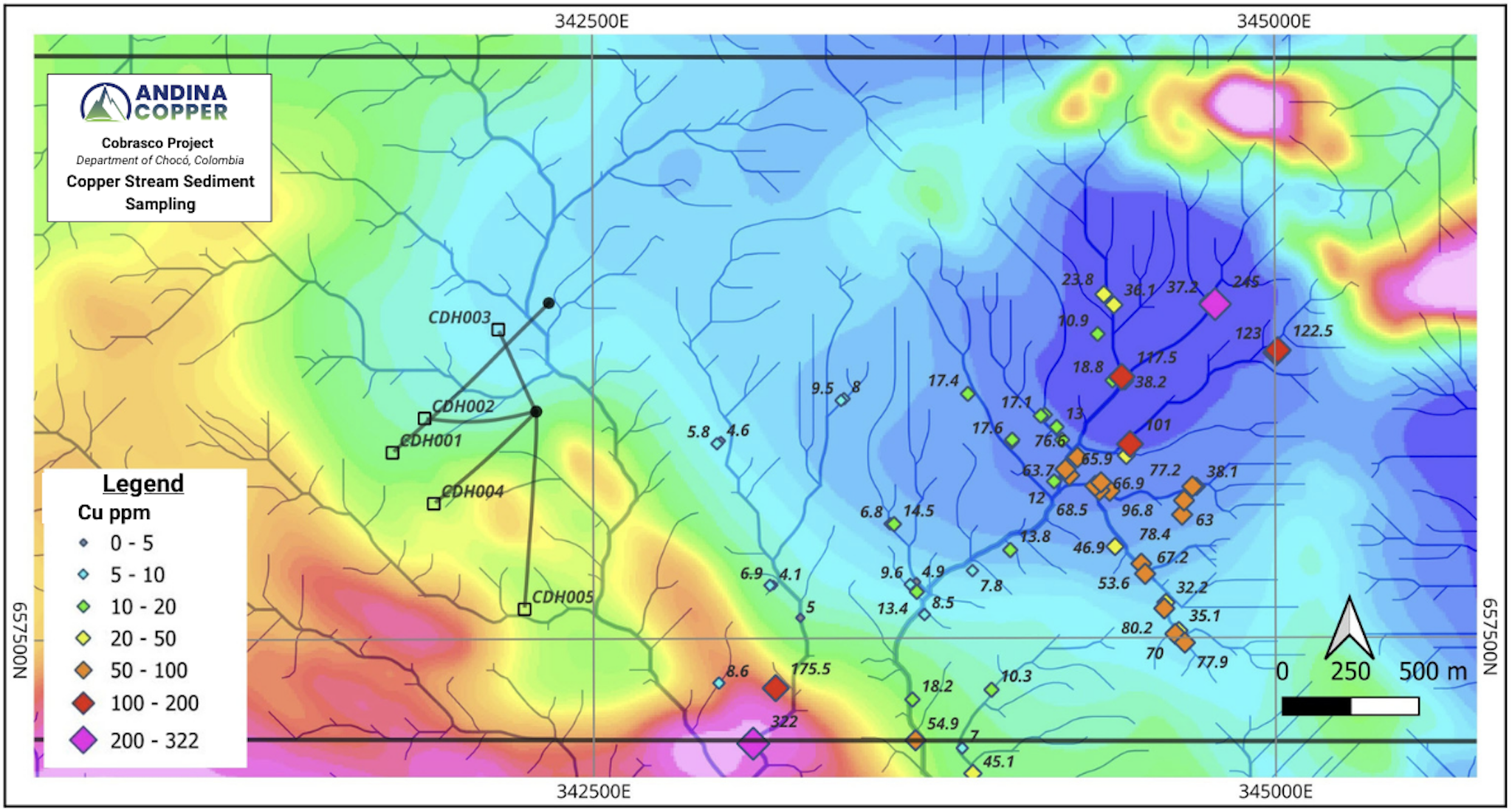 Figures 1, 2 and 3 show the results of recent stream sediment sampling, rock chip geochemical sampling and grid-based soil (auger) geochemistry completed over the northern Cobrasco block.